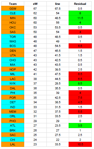 The 2017-2018 NBA season begins tomorrow night! Here are my predictions for how many games each team will win this season. Below is my expected wins for each team, the Vegas line, and the difference between my prediction and the line.
